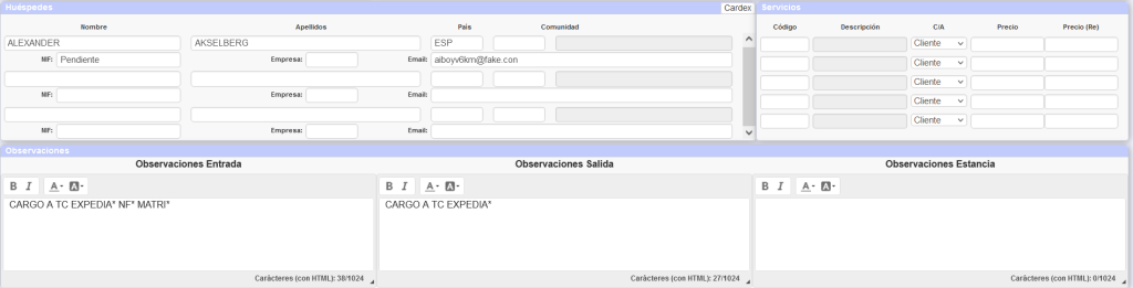 En este apartado registramos los datos de los huéspedes: nombre, apellidos, nacionalidad, Comunidad o región, Documento de identidad, código de la empresa que tenga asociada en el cardex y el email.