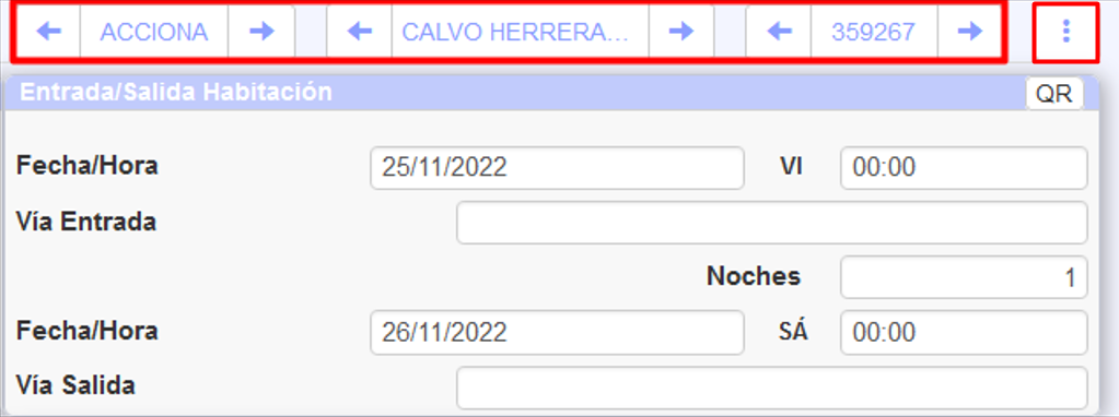 El campo marcado indica el número de habitación dentro del grupo de habitaciones que compone la reserva. En el ejemplo es la primera de dos habitaciones.