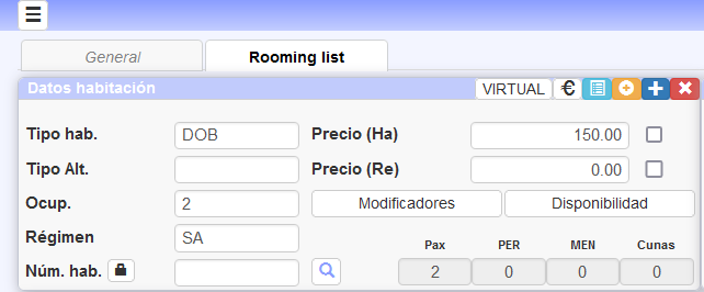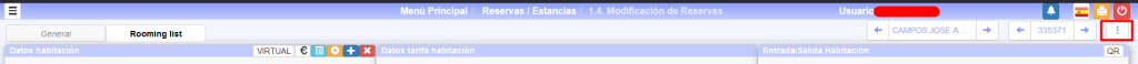 La pestaña siguiente a General nos permite acceder a la Rooming list. En Altas los primeros datos son arrastrados de la pestaña anterior. En Modificaciones veremos los posibles valores.