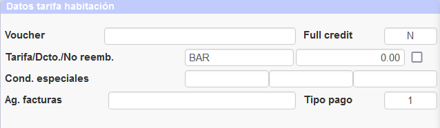Tarifa/Dcto./No reemb. Nos toma automáticamente la Tarifa que figura en el Cardex (hasta 5 Tarifas), o si el usuario está autorizado puede tomar cualquier Tarifa de la Base de Datos. Es uno de los campos más importantes de la Reserva, nos va a determinar el importe del la misma. Consta de 3 campos: