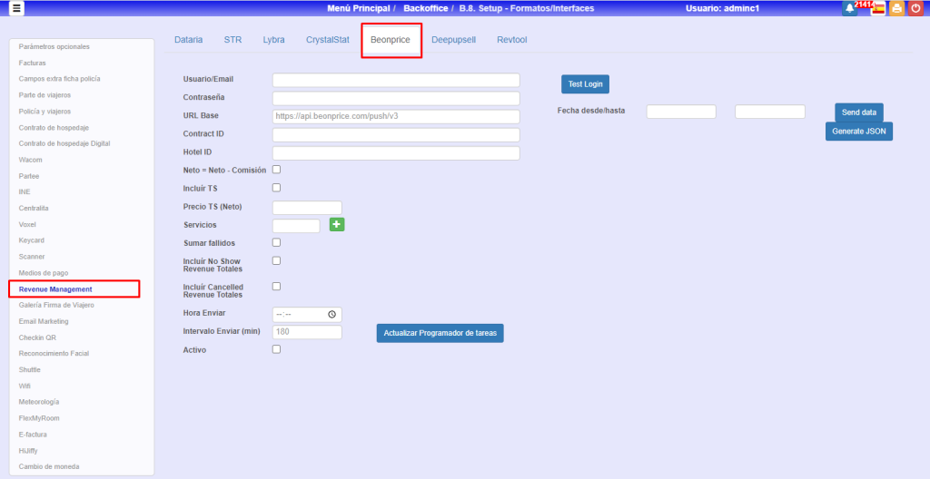 Además, podemos generar o realizar un envío manual de datos entre las fechas que establezcamos. Si pinchamos en “send data” enviará los datos a Beonprice y si pinchamos en “Generate JSON” se descargarán dos ficheros (reservations.json, totals.json) con los datos.