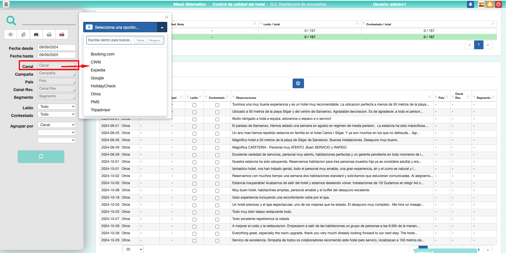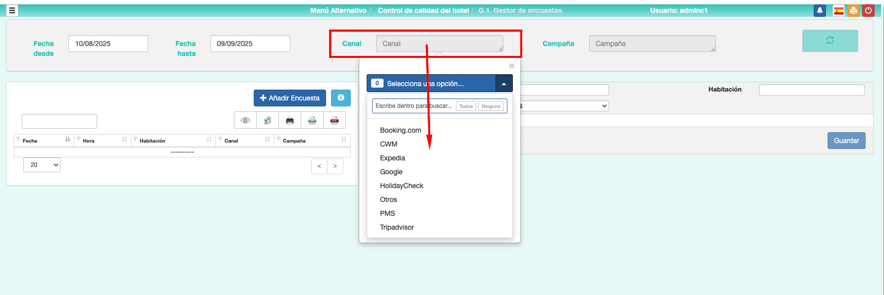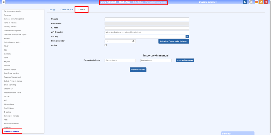 • Primer paso: Obtener Canales: Una vez configurada la conexión, pulsando este botón, aparecerán todos los canales de Dataria que se deben mapear con los que hay definidos en el pms, para que las reseñas en la opción Menú Alternativo => G.1. Gestor de encuestas y Menú Alternativo => G.2. Dashboard de encuestas, en el apartado Canal, tomen este dato correctamente.