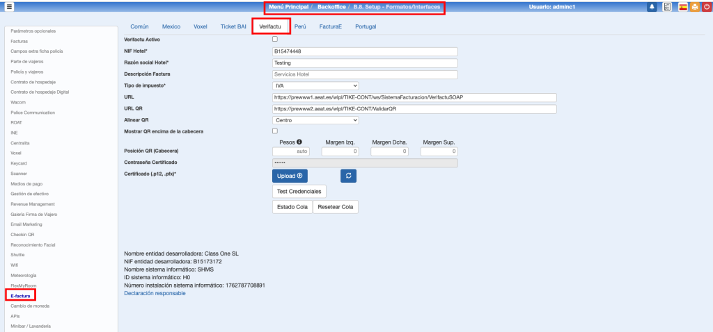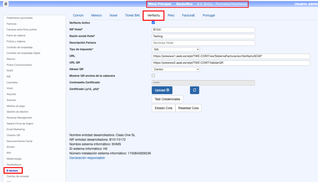 Los parámetros de configuración son idénticos a los vistos en PMS. En este caso, están la opción B.7.E-invoice.