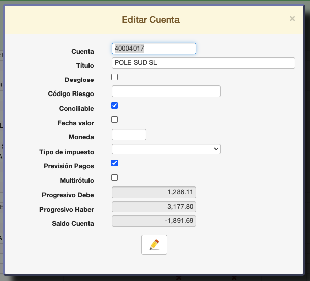 - Progresivo Debe/Haber/Saldo Cuenta: Datos de los valores actuales de la cuenta.