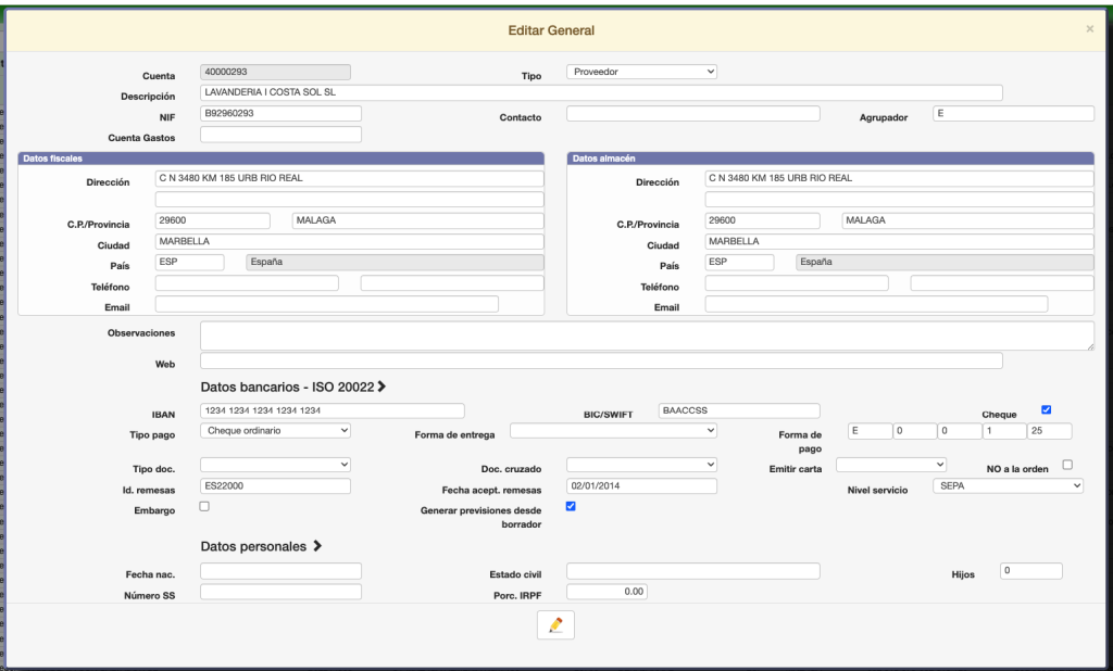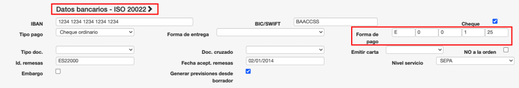 En el caso de proveedores, podemos definir los datos bancarios para las remesas de pagos. Dentro de este apartado vemos Formas de pago con 5 campos:
