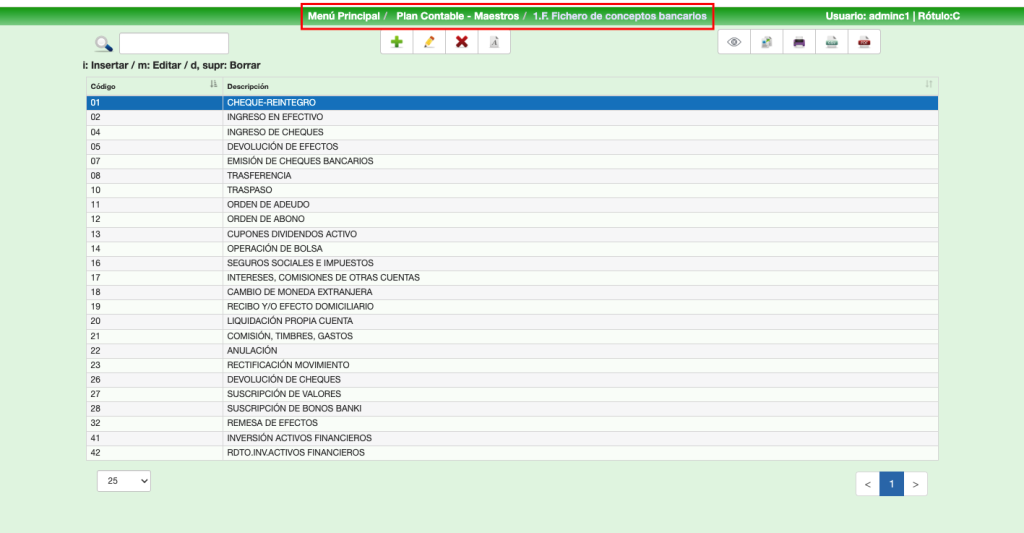 Aunque en principio deberían de ser estándar, previniendo posibles cambios, o bien que no le gusten las descripciones como las da su banco principal, puede poner las descripciones que desee. En este apartado se mantienen dichos registros. Las descripciones las de la imagen anterior.