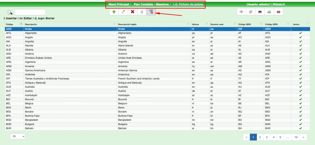 Podemos activar o desactivar países en función de nuestras necesidades. Si pulsamos el icono señalado con la flecha vemos la lista completa de todos los países, los que están activos y los que no.