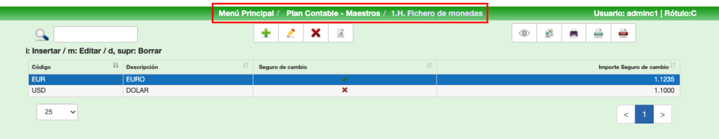 - Moneda: En el caso de Cuenta en Diferentes Monedas según la configuración creada en 1.H. Fichero de monedas.