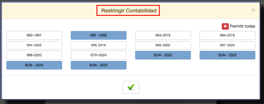 - Contabilidades restringidas: Se pueden seleccionar las contabilidades a las que el usuario puede acceder.