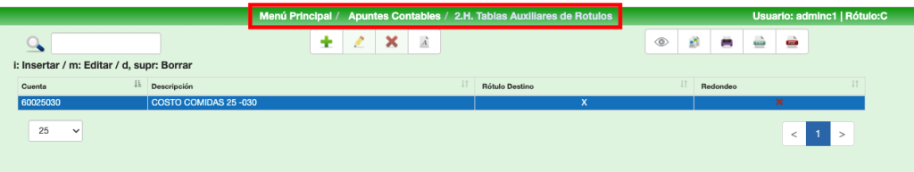 En este apartado se definen las cuentas destino de cada rótulo y los porcentajes de reparto de dicha cuenta.