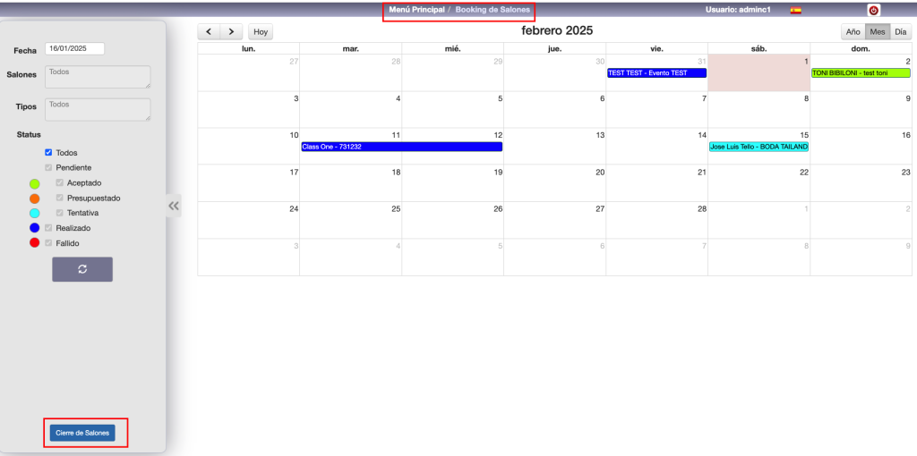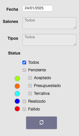 - Salones: Podrá aplicarse un filtro para los salones seleccionándolos en el popup. Los salones coincidirán con los definidos en los ficheros Maestros.