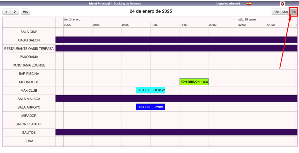 En el modo de visualización por Día, se muestran todos los salones y las OS que tienen asignadas.