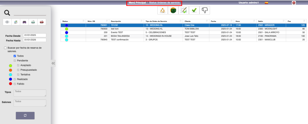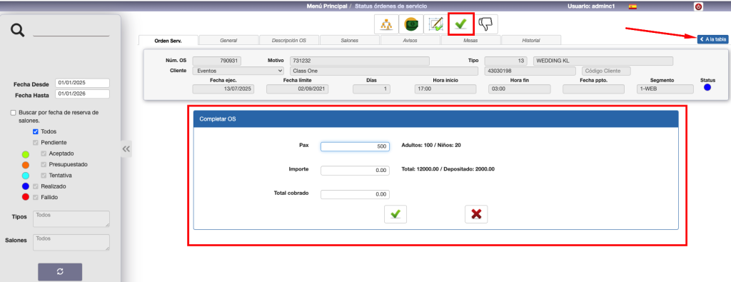 Se cambiará el Status a OS/BEO Realizada. Además nos solicita confirmación de las personas que han participado en la OS/BEO, al igual que los importes facturado y Cobrado.