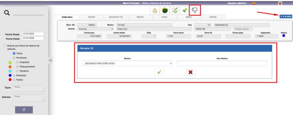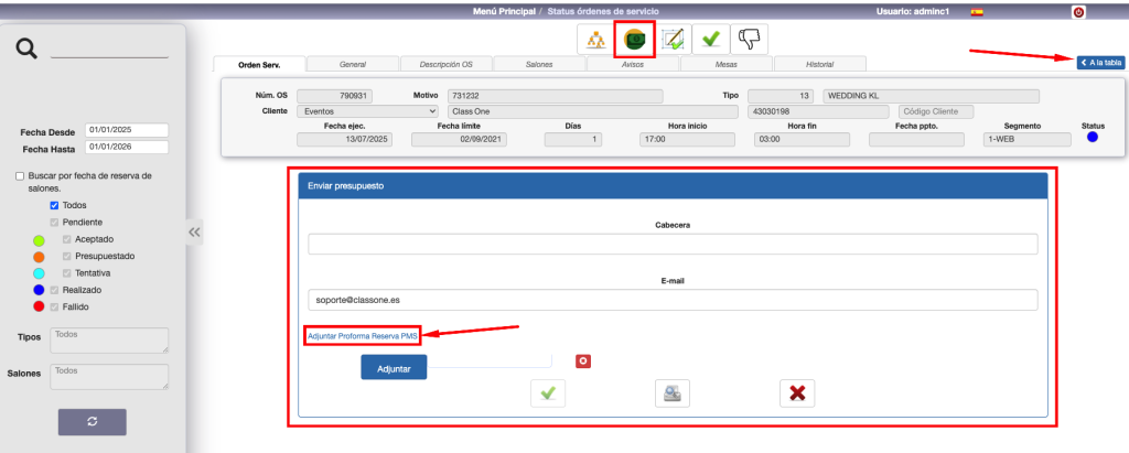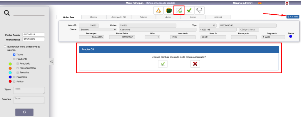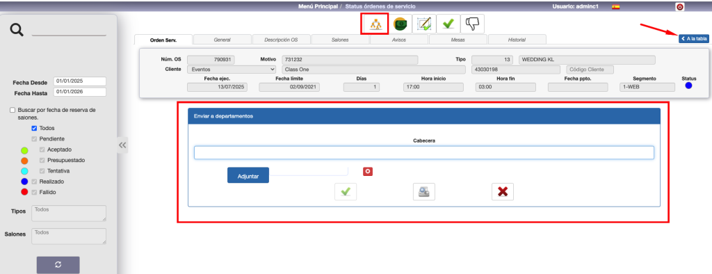 Se puede acceder a las distintas pestañas de la OS para consultar los datos y, con el botón A la tabla, regresamos al listado anterior.