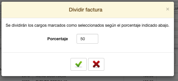 • Dividir: para dividir la factura. Se dividirán los cargos marcados como seleccionados según el porcentaje indicado.