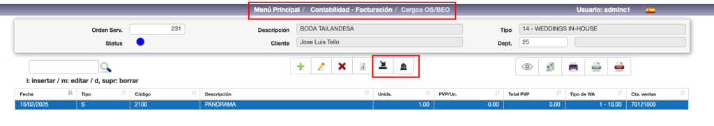 En esta opción se pueden gestionar los cargos que se van a facturar a una OS. En la cabecera se puede modificar el Departamento, si fuese necesario.