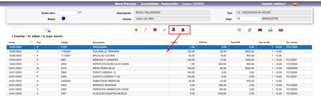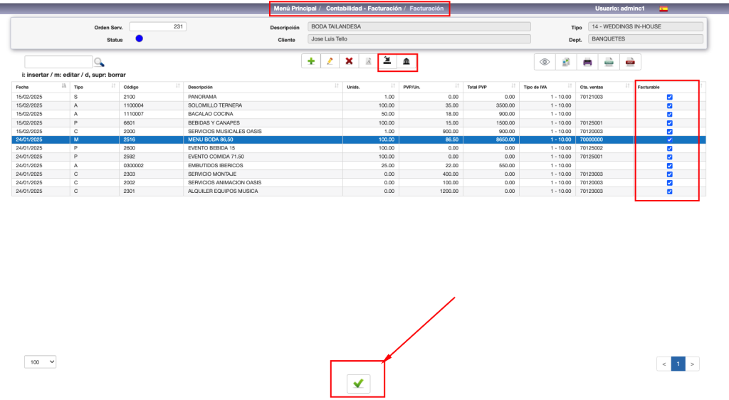 Una vez seleccionada la OS que se desea facturar, el sistema avisa de que hay cargos pendientes de facturar. En la columna Facturable, se muestran todos los conceptos que se van a incluir en la factura. Se pueden marcar/desmarcar para que se incluyan o no. Desde esta opción también se pueden importar Presupuesto y salones.
