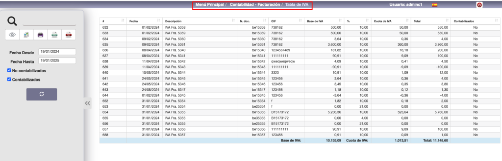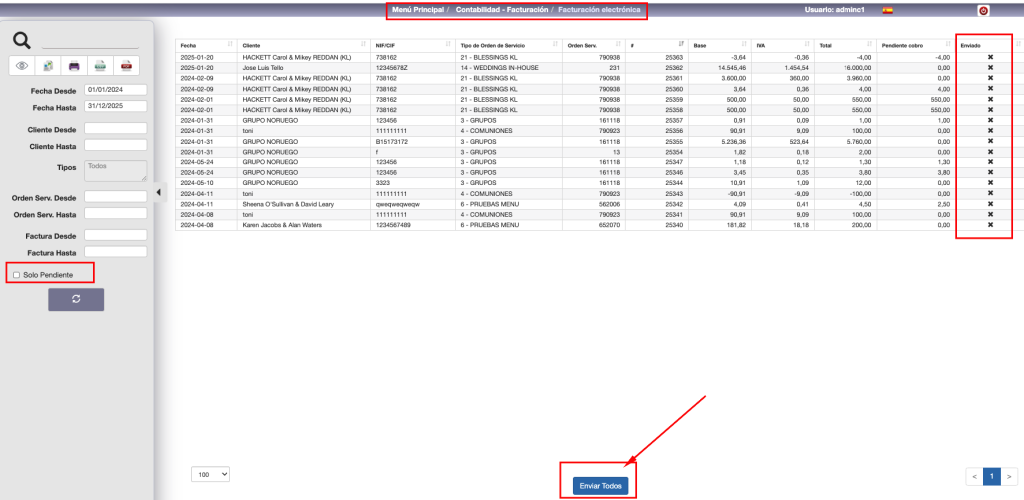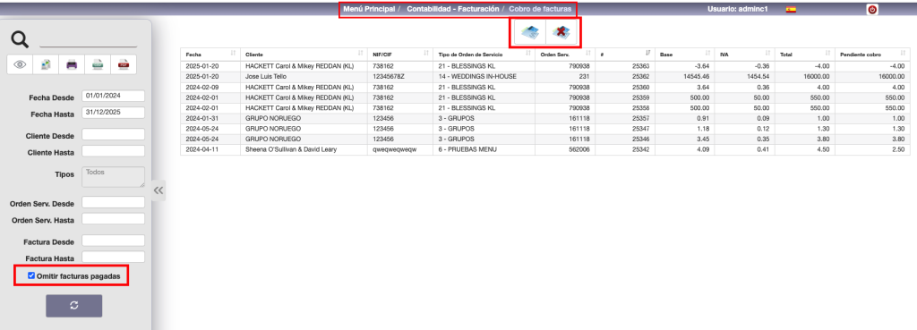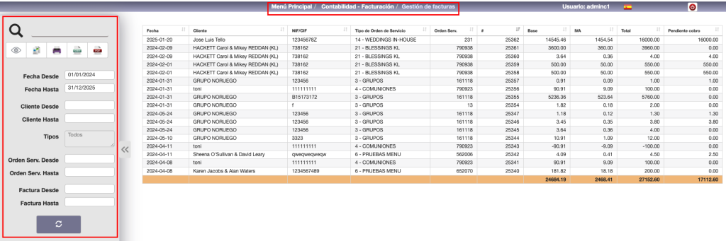 En esta opción se muestran las facturas para su gestión. Los filtros de la izquierda permiten localizar más fácilmente cualquier factura.