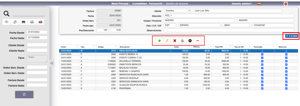 • A la tabla: retorna a la tabla anterior con el listado de facturas.