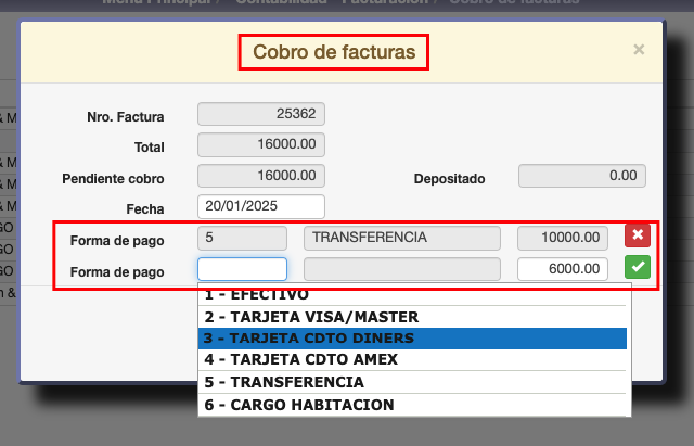 Como en todas las aplicaciones, el proceso de cobro pide una fecha y una Forma de pago. Se admiten varias formas de pago modificando los importes en cada una. El saldo restante se va actualizando automáticamente.