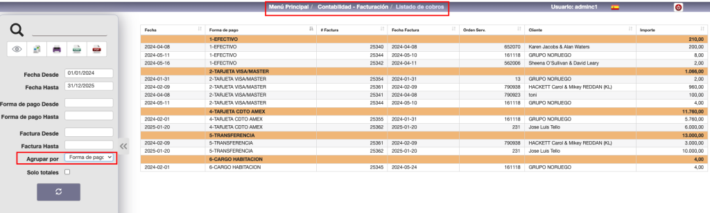 Esta opción nos permite tener un listado de los cobros realizados en función de los filtros que apliquemos.