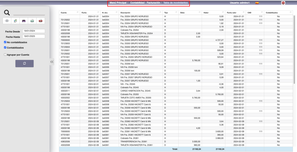Podremos comprobar todos los movimientos generados en los apartados C.2. Tabla de Movimientos y C.3. Tabla de IVA.