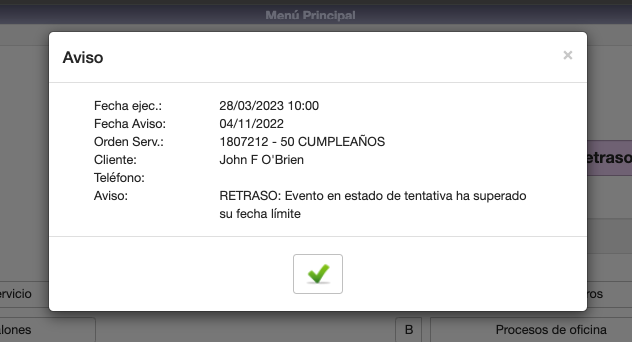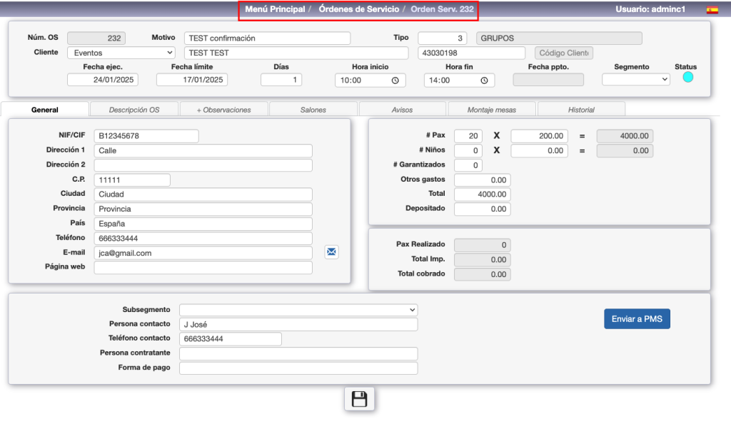 En los datos de cabecera de la OS/BEO, al crear una nueva OS, en primer lugar se asigna un número que es correlativo al último que se haya dado. A continuación, se debe indicar el motivo o nombre del evento. Una vez introducido el cliente, se comprueba si existió alguna OS anterior de dicho cliente y, en caso afirmativo, da la opción de aceptar los datos históricos de dicho cliente.