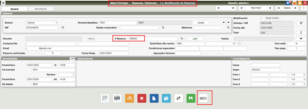 En la reserva de hotel aparece el botón BEO para acceder directamente a la gestión de salones de BEO.