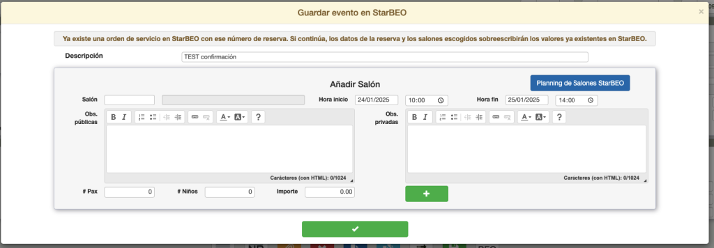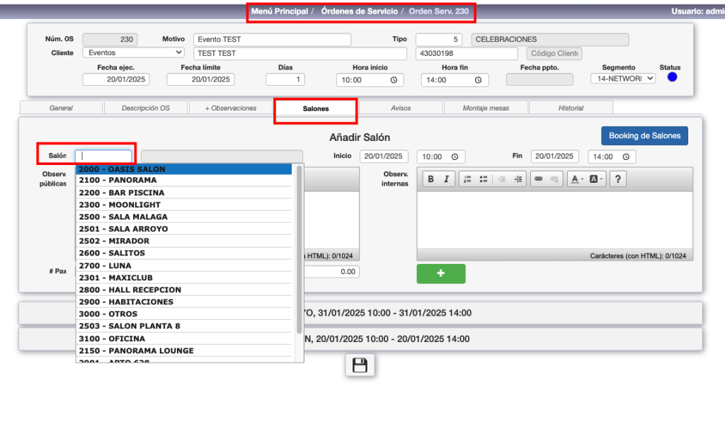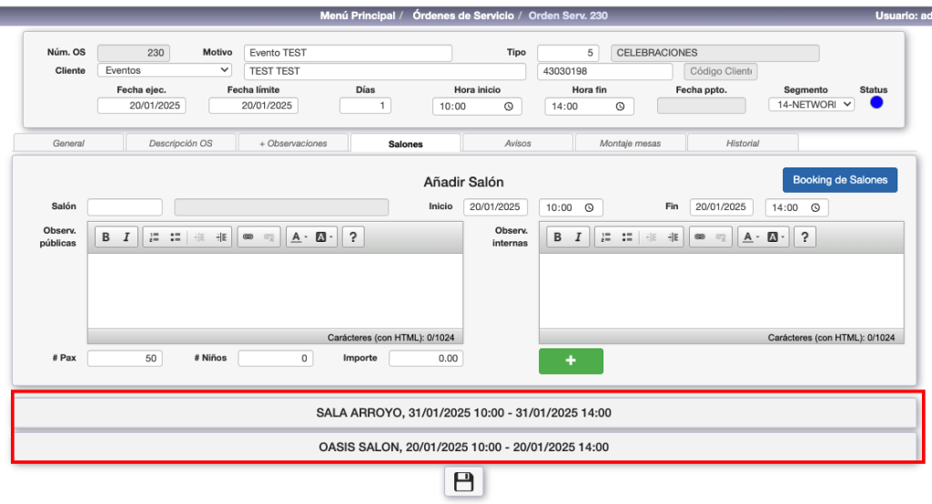 En esta pestaña elegimos los salones que se van a usar en la OS. Se debe indicar la fecha y hora de uso para que queden bloqueados en el Booking de Salones. Esta pestaña está relacionada con el planning de la opción 2. Booking de Salones.