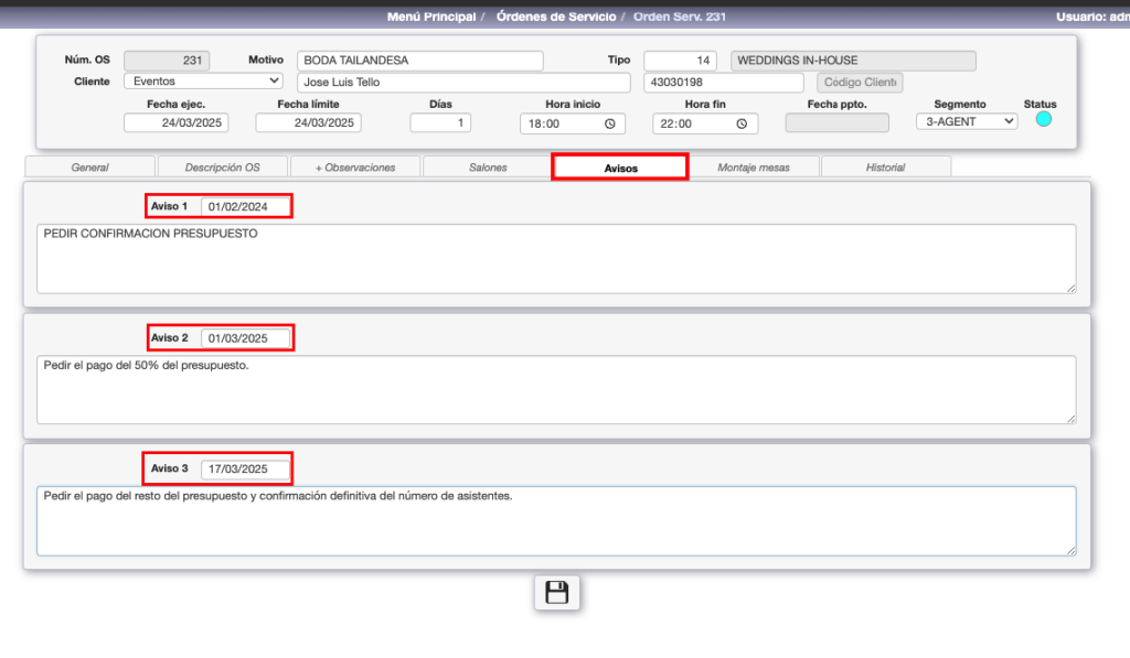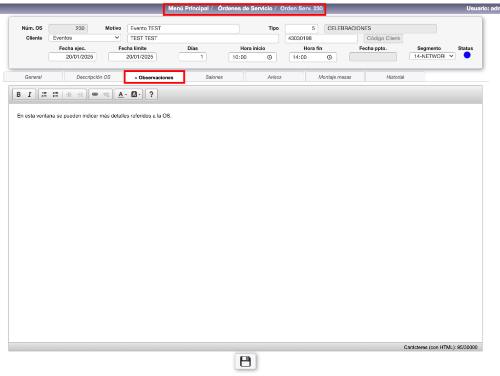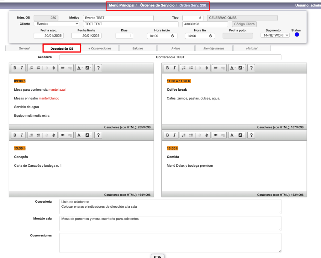 En esta pestaña hay 4 ventanas con editor de texto para detallar todo lo necesario en la OS y otros tres campos adicionales con detalles para Consejería, Montaje de la sala y Observaciones.