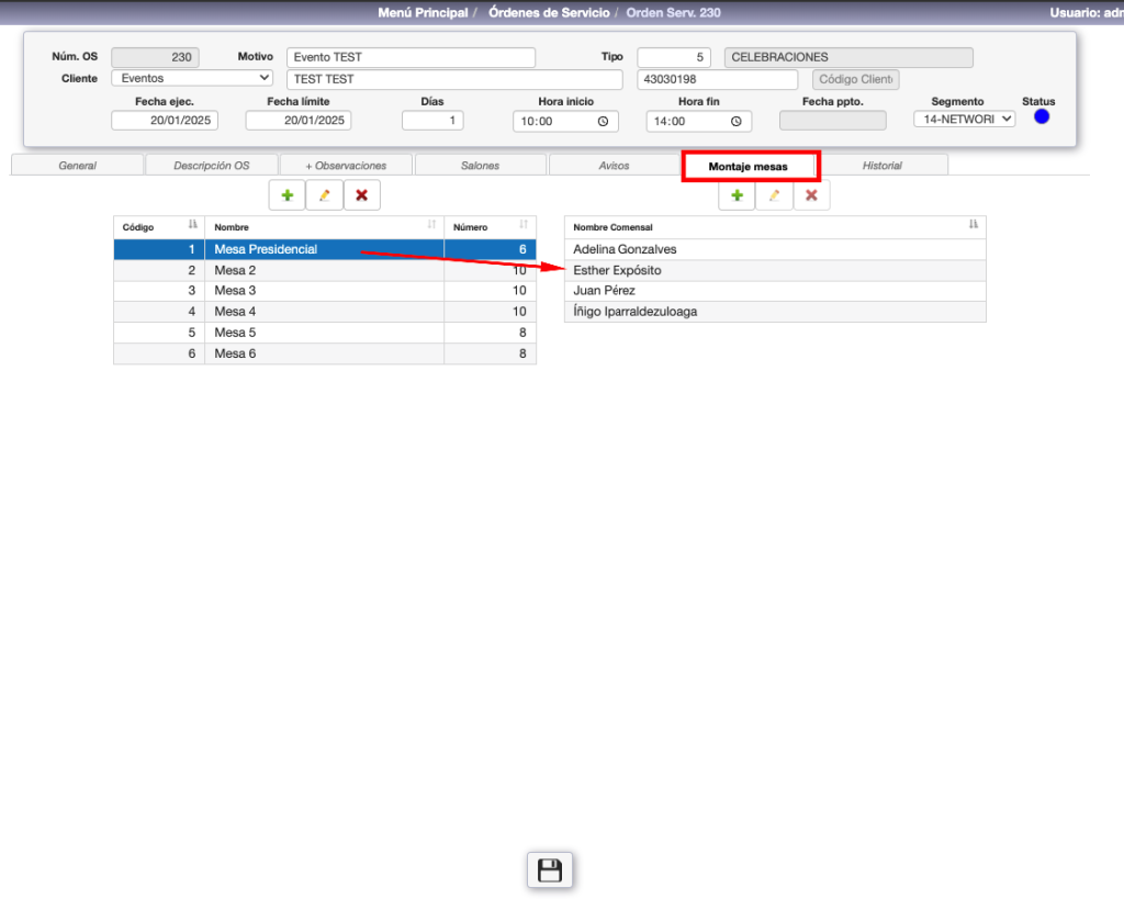 En este apartado se configura la distribución de mesas del evento. En cada mesa se pueden indicar los comensales que se sentarán en ella.