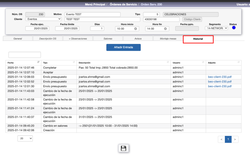 La pestaña Historial detalla las diferentes fases que se han tenido de un evento, incluso aquellas que hemos podido introducir manualmente.