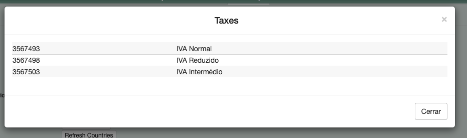 - Tax IDs: Pulsando en el botón de “Get Taxes” podremos ver los valores indicados, que son los impuestos definidos en Moloni. Deberemos rellenar tantos tipos de IVA como usemos, generalmente serán 4 (Tax ID 1 = el normal al 23%, Tax ID 2 = el intermedio al 13%, Tax ID 3 = el reducido al 6% y Tax ID 4 = el exento)