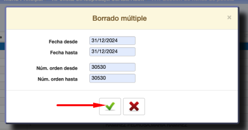 Una vez identificado el número de parte que se quiere eliminar, en la opción 7.1. Gestión de fichas de policía hay un icono de una papelera. Pulsándolo, se muestra un popup en el que se indica la fecha y el número del parte. Aceptar para borrar.