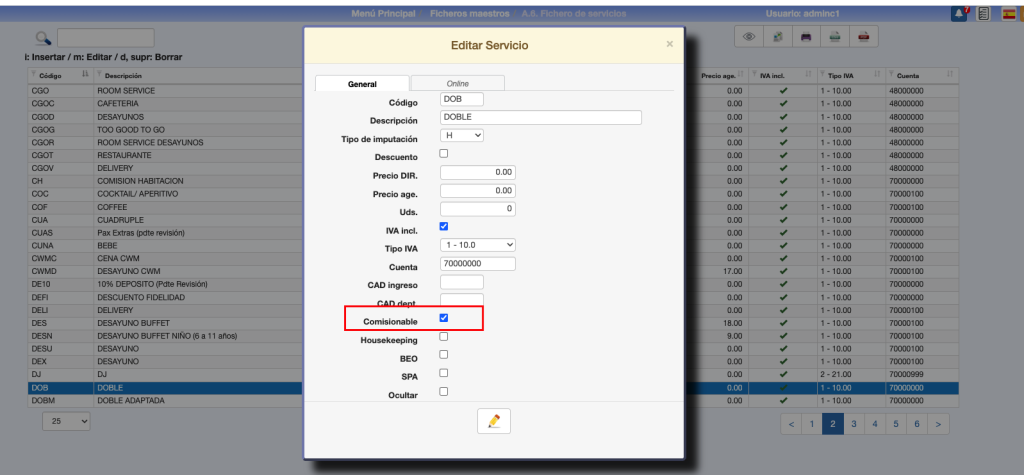 Revisar que en la opción A.6. Fichero de servicios, tanto las habitaciones como los regímenes y los servicios que correspondan están marcados con el check de Comisionable.