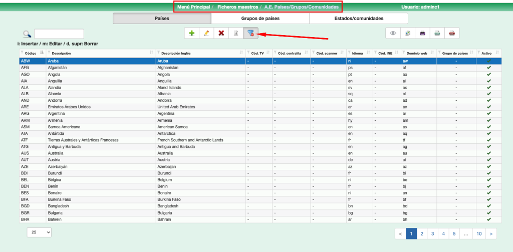 Podemos activar o desactivar países en función de nuestras necesidades. Si pulsamos el icono señalado con la flecha vemos la lista completa de todos los países, los que están activos y los que no.