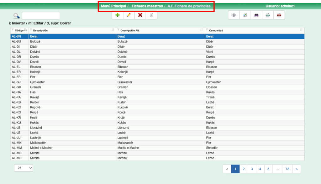 Class One suministra un fichero con todos los códigos de los países, CCAA, provincias (UE/USA/Canadá/Brasil/México/Argentina/Chile).