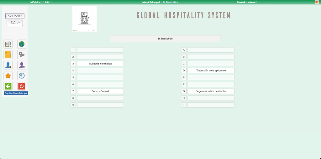 Se dispone de un total de 12 Roles o categorías que se asignaran a cada usuario. Además existe una clave superior de administrador que siempre podrá acceder a todo el sistema y que no se regula en este apartado. Dicha clave es perteneciente a la propiedad y solamente la debe saber el estamento más alto de la empresa / Hotel.