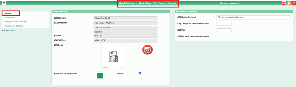Datos del Hotel. Los campos 01 a 04 no accesibles por el usuario. Su manipulación implicaría denuncia a BSA.