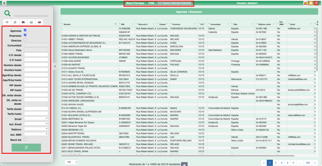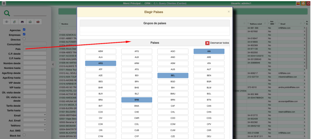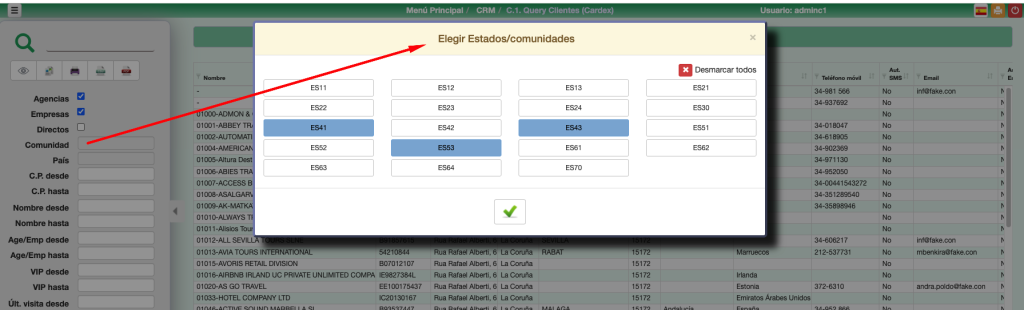 Además de estos filtros geográficos, se disponen de otros filtros complementarios como el código postal, nombre del cliente, agencia o empresa, nivel de VIP, Canal y Segmento, fecha de última visita, tarifa aplicada, si dispone de email y de autorización para enviarle correos, teléfono y si está marcado como Black list.