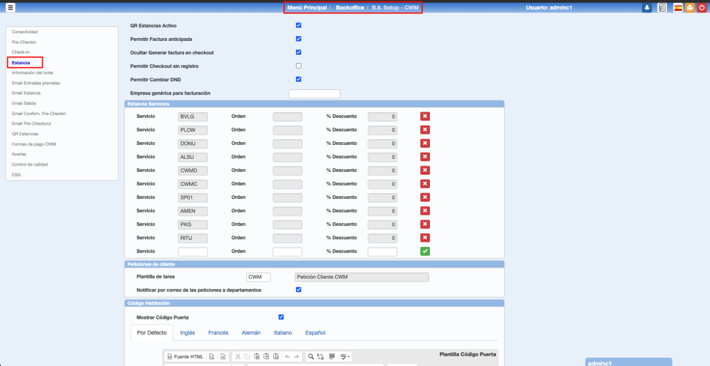 Dentro de este apartado podremos configurar los distintos servicios y opciones que se ofrecerán al huésped desde el Precheckin del CWM.