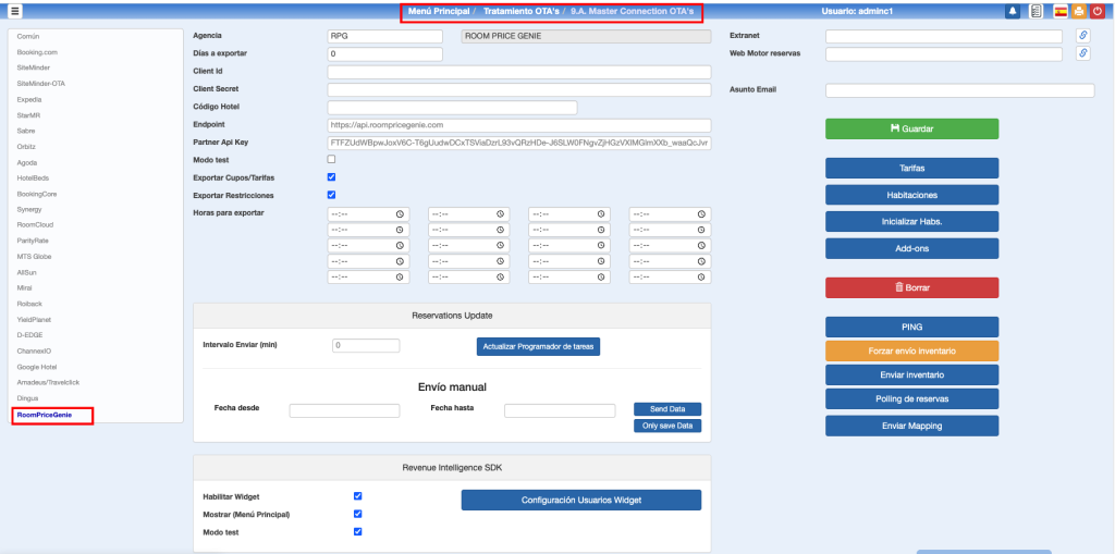 - Modo test: Si se activa este modo de pruebas, sólo se genera el inventario, sin enviar nada a RoomPriceGenie.