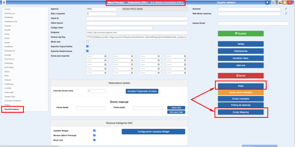 Para comprobar que la configuración es correcta y que nos podemos conectar a RoomPriceGenie podemos hacer click en el botón de Ping