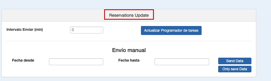 - Intervalo Enviar (min): Cada cuántos minutos se envían las reservas. Si se modifica el intervalo, es necesario Actualizar el Programador de Tareas pulsando el botón.