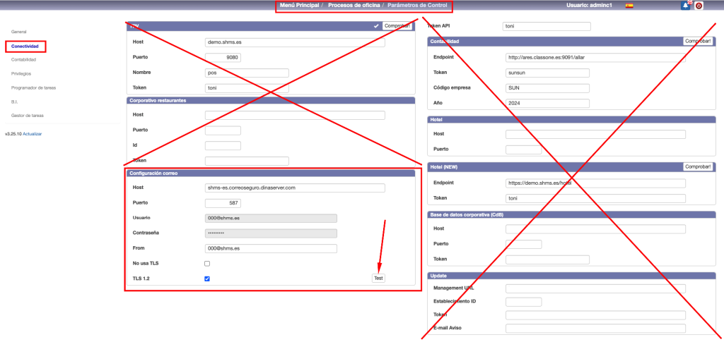 Debido a que desde SPA se emiten diferentes correos, tanto internos como externos, debe solicitar a su proveedor que le dé los datos para este apartado, si no están debidamente configurados no les funcionarán el envío de correos. Una vez tenga todos los datos introducidos puede hacer un Test para comprobar el correcto funcionamiento.