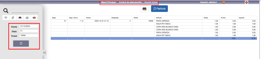Desde esta opción es posible reimprimir un ticket en la impresora o emitir una factura de con los datos fiscales del cliente.