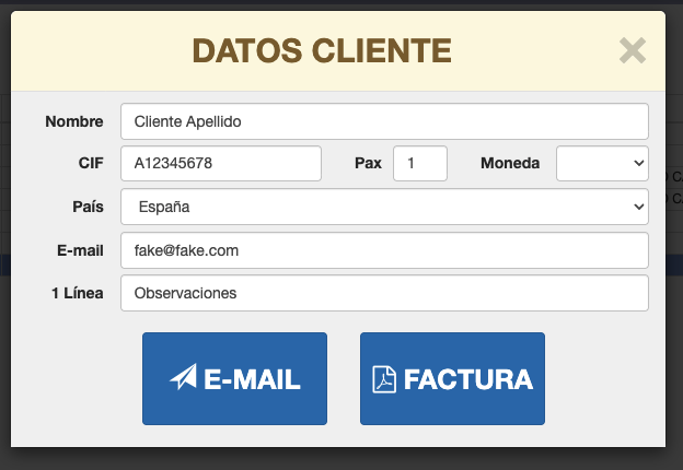 Una vez se indiquen los datos del cliente, pulsando el botón E-mail, se envía adjunto el PDF de la factura. Pulsando el botón Factura se genera un PDF para su impresión en formato A4.