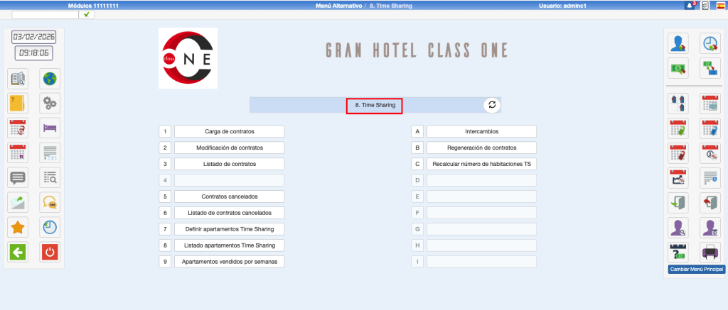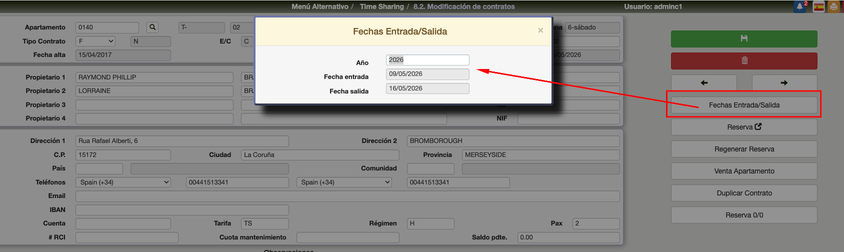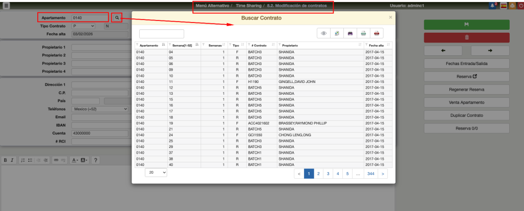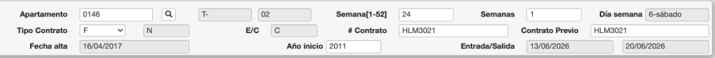 Apartamento: Número del apartamento. Los dos siguientes campos, que no editables, son el tipo de apartamento y el ranking definido en 8. Listado Apartamentos Time Sharing.