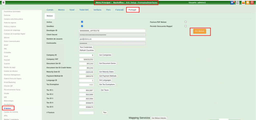Desde la opción B.8. Setup Formatos/Interfaces => E-factura => Portugal disponemos de un botón Fix Moloni para acceder a la herramienta.