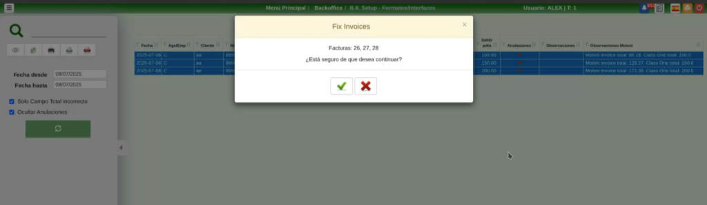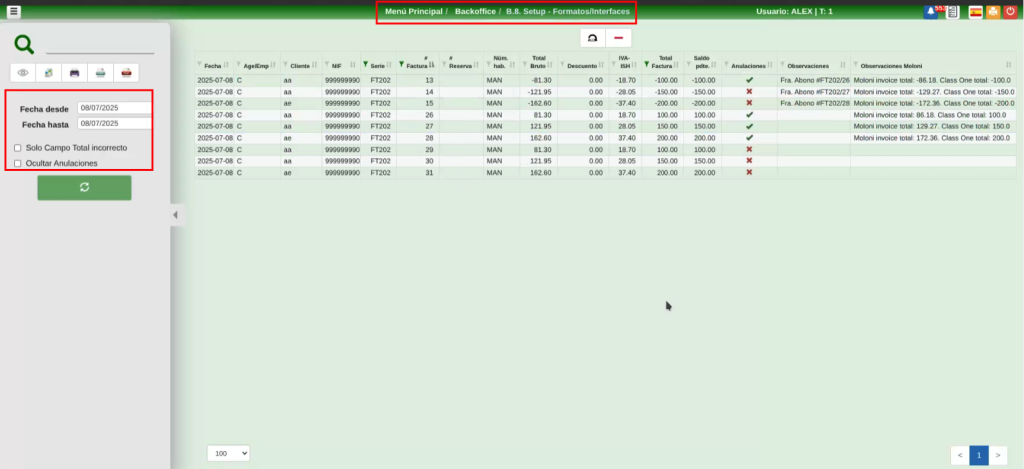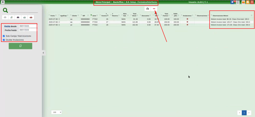 Marcando los dos checks se mostrarán sólo las facturas que tienen alguna discrepancia entre los totales en Class One y Moloni, que son las que habrá que corregir mediante abono y una nueva factura.